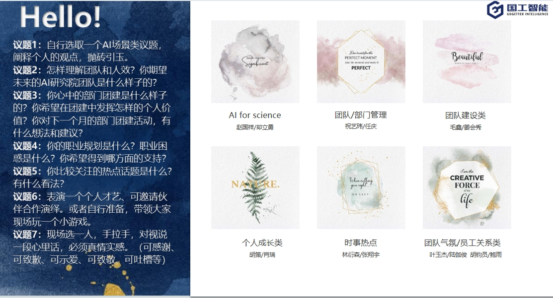 活動以“AI暢想”為核心,圍繞學術議題、團隊管理、個人成長等多個維度展開討論,充分展現了國工智能團隊的專業素養和創新精神。通過“對AI技術的產業落地應用”等議題認領和現場互動環節的依托,國工智能不僅收獲了團隊成員間更深層次的相互理解和信任,還加強了團隊成員間的溝通與協作能力,這將為公司未來的發展提供堅實的人文基礎?;顒又校课粎⑴c者都獲得了寶貴的交流機會,無論是在專業領域的深入探討,還是在個人層面的情感交流,都極大地豐富了團隊的文化內涵。
