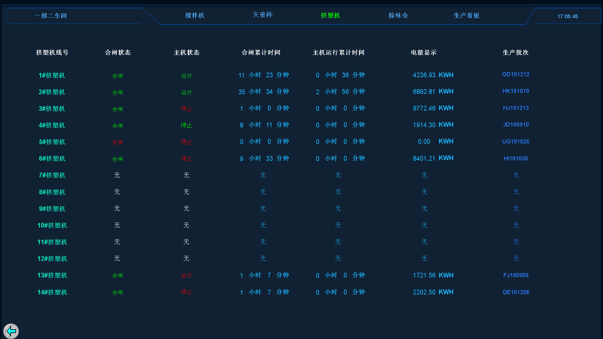 從生產的數據的角度主要是進行的數據采集、整理和分析。形成報表等相應的表單,通過對每一個生產線數據的分析,實現對生產組織,工藝指標的嚴格控制,保證產品的質量和降低生產能耗的生產目標。 從管理角度主要指執行下達的工單任務單能得到,準確,無誤的執行,調度生產過程所需要的各種資源,協調生產的相關運作環節,為企業管理人員提供生產過程的監督保證生產的平穩、持續進行。 通過對高速攪拌機、矢重秤、螺桿擠塑機、均化倉、自動換網機的生產過程數據來判斷生產質量和設備狀況等信息;