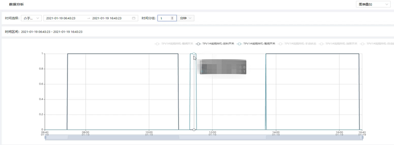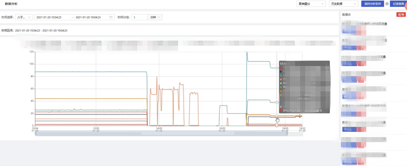 根據用戶的需要,對一段時間內的歷史數據或實時數據按照一定的統計頻率進行多個維度的數據分析,統計頻率包含不限、10秒、30秒、10分鐘、30分鐘、1小時,通過添加變量操作,在彈出的變量選擇彈窗中可多選數據點信息進行分析;數據分析得到的圖表顯示形式包括折線圖以及表格形式。多個數據點信息圖表的展示形式包括平鋪、疊加、標簽顯示以及合并表格顯示,根據不同的需求選擇對應的展示形式,靈活性高。數據分析幫助用戶分析用戶想要分析的內容,如數據走向,問題等,可以將分析的邏輯進行保存并可以按部門和人員進行公開,從而幫助用戶解決問題。(可參考圖1.1)