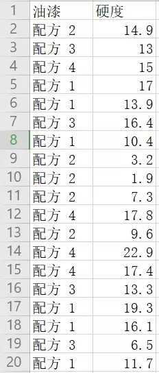 某化學(xué)工程師想要比較四種油漆混料的硬度。每種油漆混料取六份樣品涂到一小塊金屬上,待金屬塊凝固后再測量每種樣品的硬度。為了檢驗(yàn)均值是否相等,并評(píng)估均值對(duì)之間的差分,分析師配合使用單因子方差分析和多重比較。所以該化學(xué)工程師通過對(duì)影響質(zhì)量的因素方面的數(shù)據(jù)統(tǒng)計(jì),得出了下列數(shù)據(jù)集合(部分):