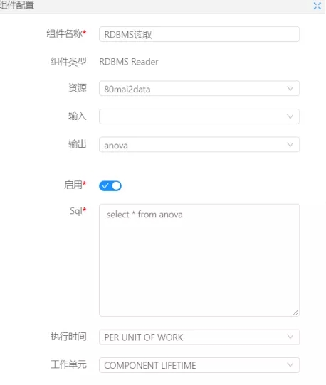 首先,我們需要在數(shù)據(jù)大腦系統(tǒng)中進(jìn)行流程的搭建,思路是從數(shù)據(jù)庫中讀取數(shù)據(jù)后,將數(shù)據(jù)投入到單因素方差分析組件中,然后對(duì)算法運(yùn)行所需要配置的參數(shù)進(jìn)行配置,下圖是對(duì)數(shù)據(jù)庫讀取組件的配置: