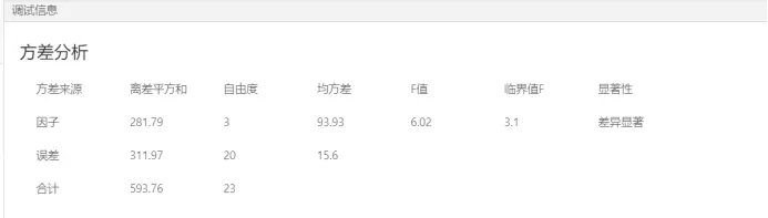 我們可以得到的結(jié)論是油漆混料的硬度明顯不同。據(jù)此得出的結(jié)論是油漆的配方對(duì)油漆混料后的硬度有顯著影響,因?yàn)閱我蛩胤讲罘治鲋会槍?duì)一個(gè)因素,所以得出的結(jié)果有限,等我們拿到這個(gè)數(shù)據(jù)之后可以在數(shù)據(jù)大腦平臺(tái)中進(jìn)行更進(jìn)一步的分析,從而可以分析配方的具體哪幾種因素對(duì)硬度影響較大。