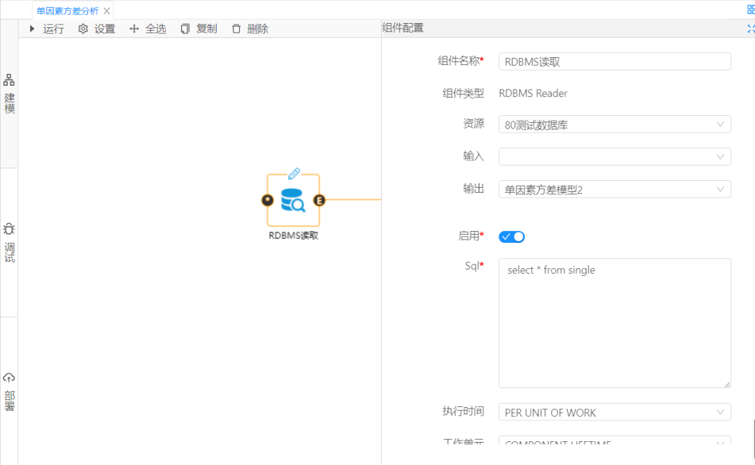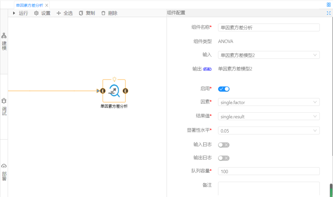使用集成好算法的單因素方差分析組件進行數據的單因素分析處理,對組件參數進行設置,因素字段配置為factor,結果值配置為檢驗結果result,顯著性水平設置為0.05,單擊運行,從調試面板中查看分析結果。