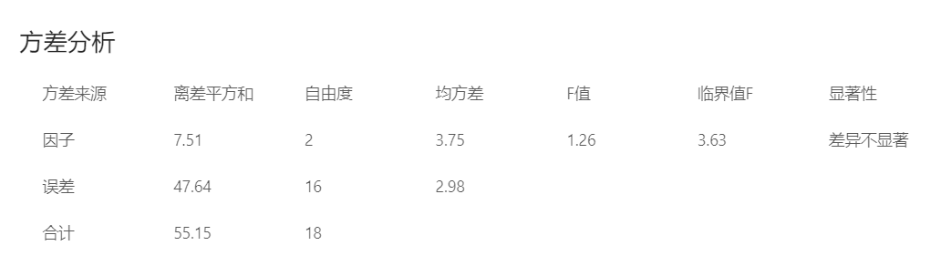 3的分析結果中可以看出,運用單因素方差分析得出的F值小于臨界值F;F值是兩個均方的比值[效應項/誤差項],不可能出現負值,F值越大(與給定顯著水平的臨界值F值相比較),說明數據之間效果(差異)越明顯,誤差項越小說明(效果)差異越小。