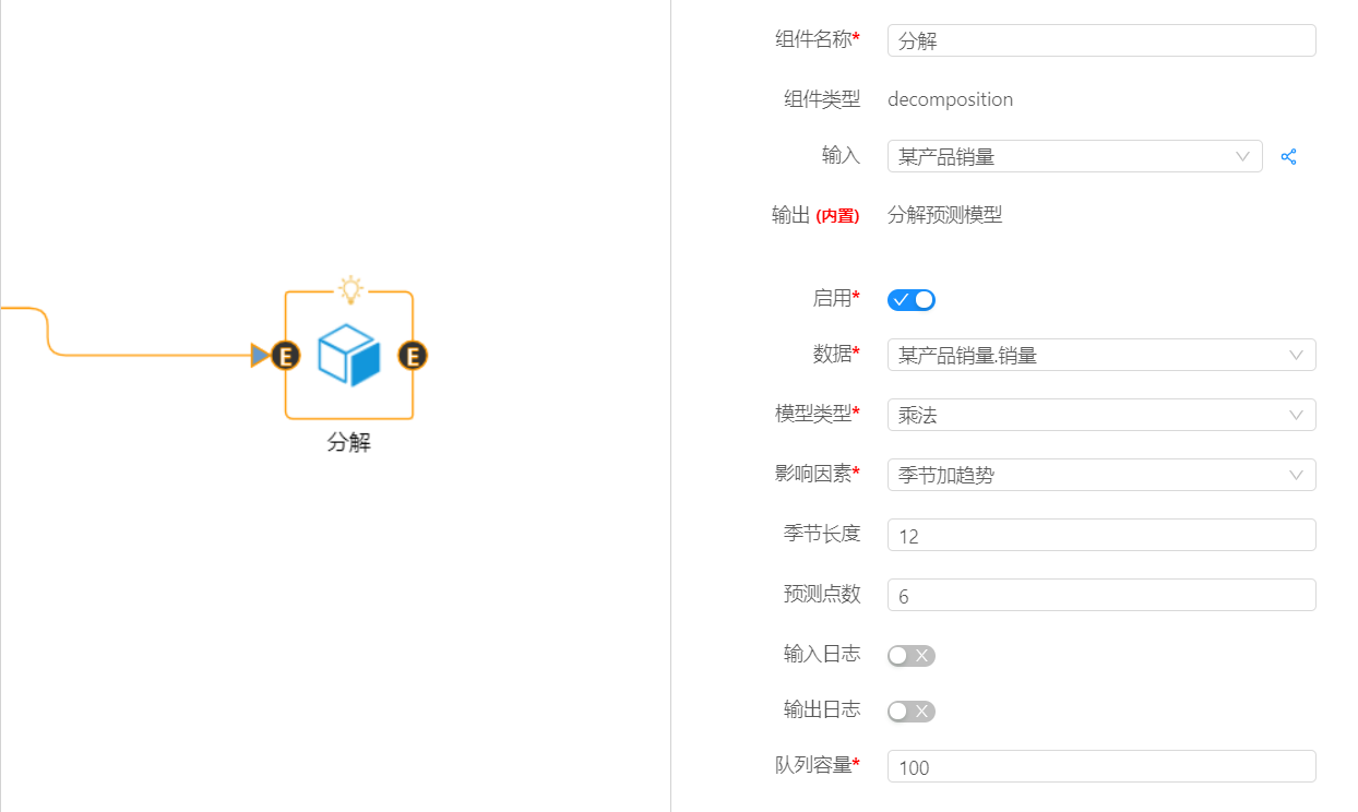 使用系統(tǒng)已集成好算法的分解組件,進(jìn)行數(shù)據(jù)的時間序列預(yù)測分析處理。對組件參數(shù)進(jìn)行設(shè)置,模型類型配置為乘法模型;影響因素配置為季節(jié)加趨勢;季節(jié)長度配置為12;預(yù)測點(diǎn)數(shù)配置為6;隊(duì)列容量設(shè)為100。單擊運(yùn)行,從調(diào)試界面查看運(yùn)行結(jié)果。
