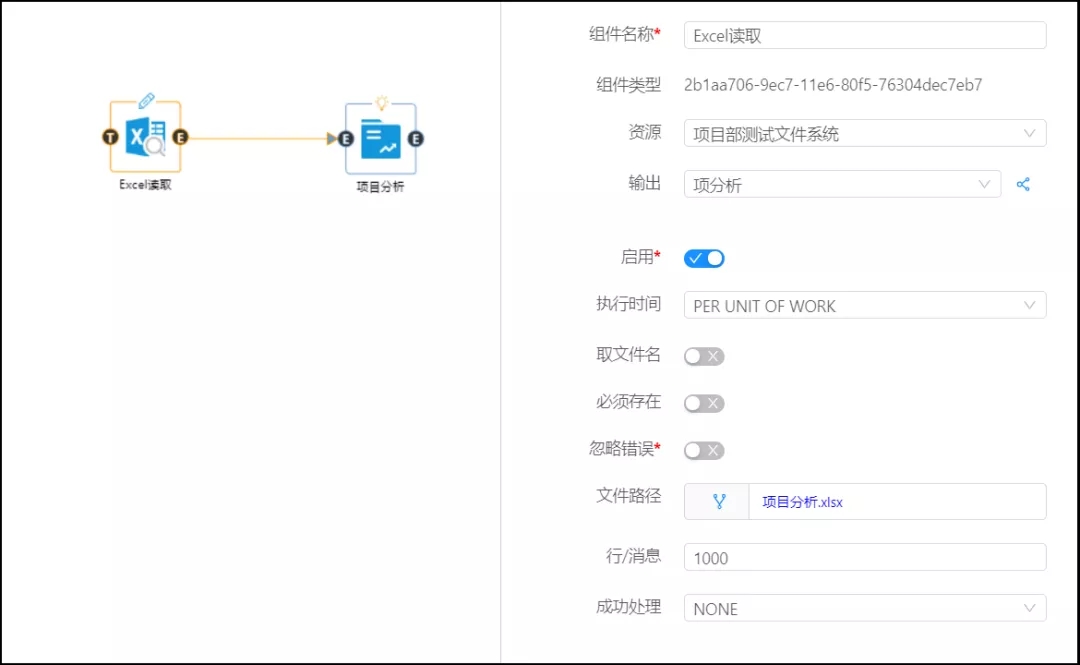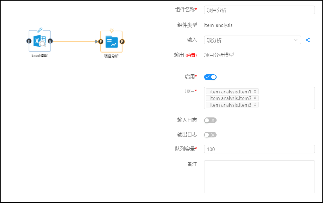 首先配置讀取組件然后從數據大腦中的組件面板查找項目分析組件,拖到工作面板,配置數據,項目分析組件參數,點擊運行。