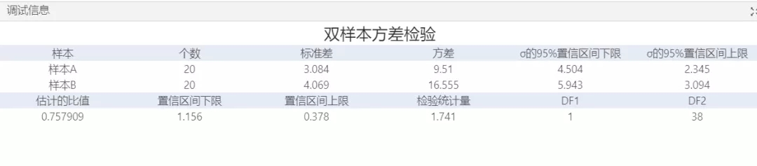 該調試信息顯示正在檢驗的假設。因為接受了默認值,原假設假定兩個總體標準差的比率為1(它們相等),而備擇假設假定該比率不為1(它們不相等)。檢驗結果顯示在輸出的底部。
