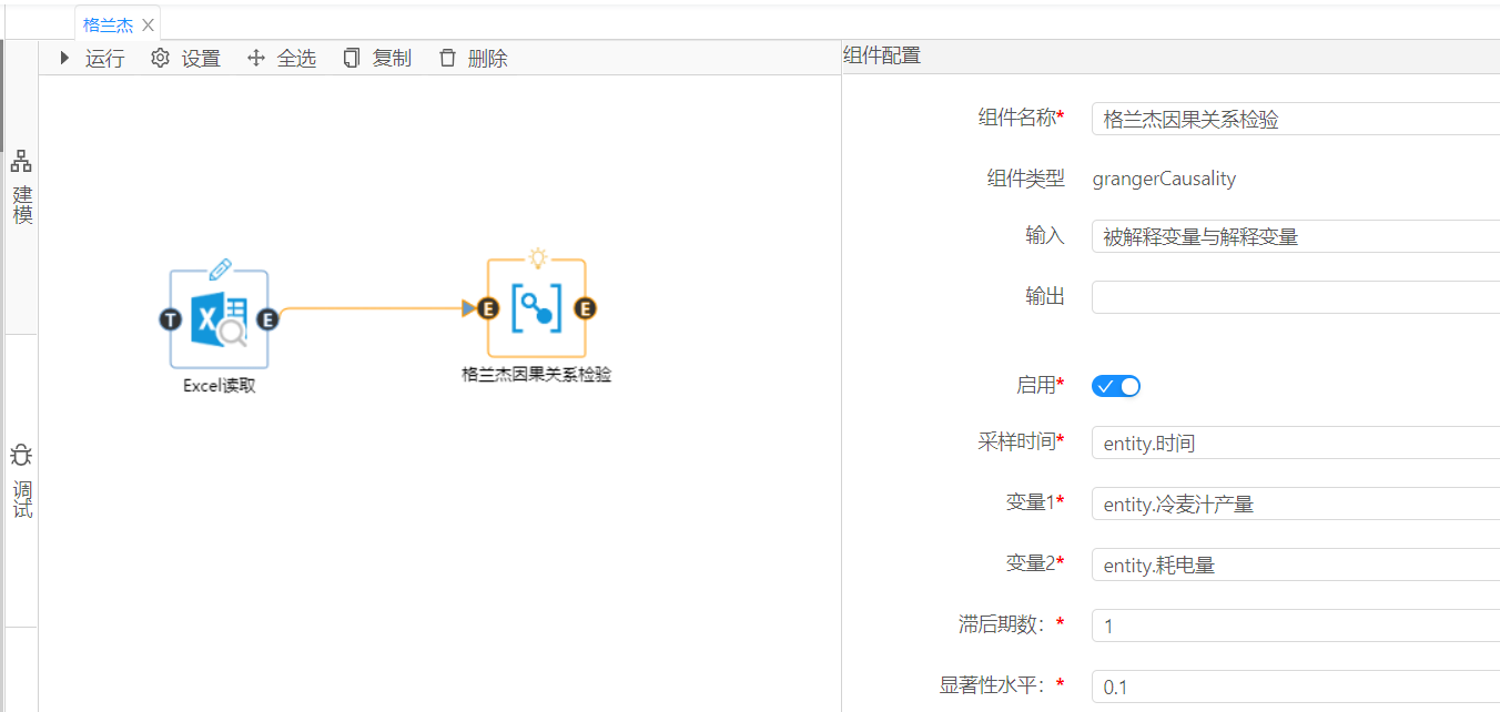 首先,從數據大腦中的組件面板搜索格蘭杰因果關系檢驗組件,拖到到工作面板,配置數據及組件參數:滯后期數選擇1,顯著性水平選擇0.1,點擊運行。過程如1: