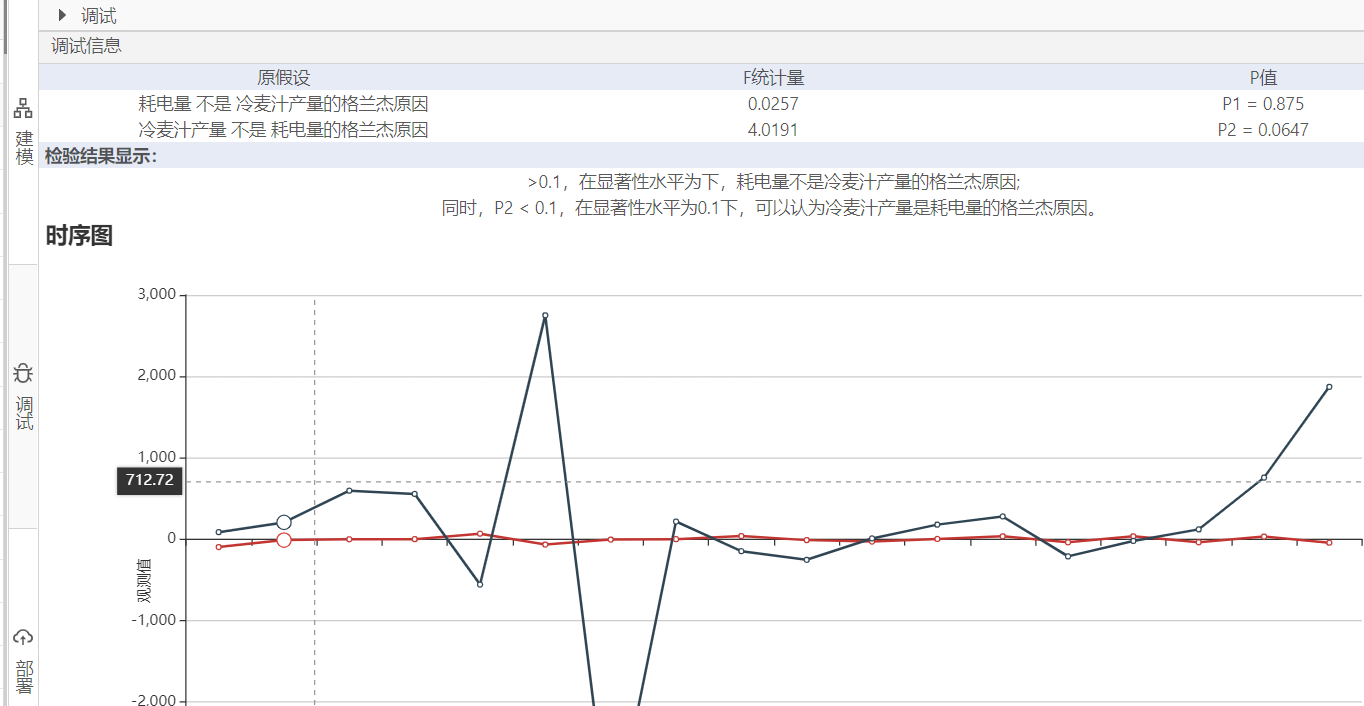 下表是某啤酒企業2005-2009年各個季度冷麥汁的產量和制冷耗電量的數據,該時間序列數據經過差分處理是平穩的,符合格蘭杰因果檢驗的前提。利用AIC信息準則確定最優階數是1,接下來將使用國工數據大腦已經集成好的格蘭杰因果關系檢驗算法對數據進行雙向因果關系檢驗,即檢驗冷麥汁的產量是否為制冷耗電量的格蘭杰原因制冷耗電量是否為冷麥汁產量的格蘭杰原因。
