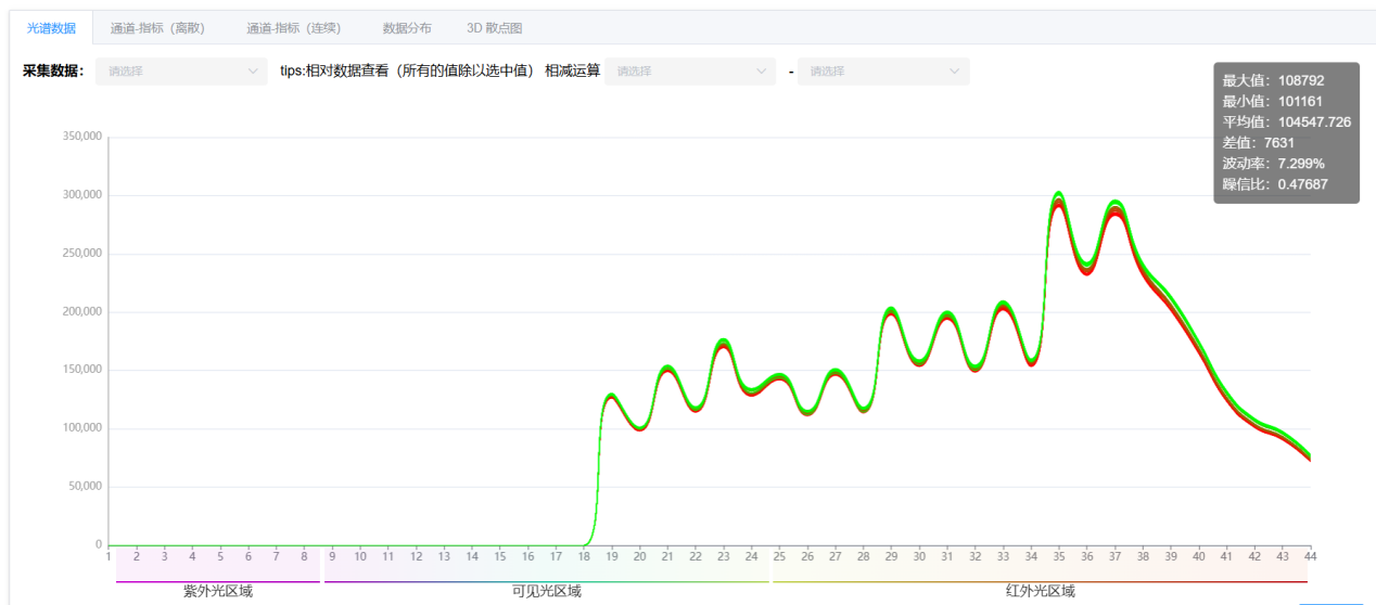 軟件系統(tǒng)通過(guò)對(duì)含水量錄入的標(biāo)定值與光譜強(qiáng)度進(jìn)行綜合分析,會(huì)得出噪信比圖以及相關(guān)性圖。其中噪信比圖表示每個(gè)波長(zhǎng)通道上光譜數(shù)據(jù)噪聲與有效信息的比值,在實(shí)際應(yīng)用中,此值越小越好。相關(guān)性圖表示所有樣品,在每個(gè)波長(zhǎng)通道上吸收強(qiáng)度與指標(biāo)標(biāo)定值的線性或者非線性關(guān)系是否良好,直接反應(yīng)出其檢測(cè)的可行性,在實(shí)際應(yīng)用中,此值越大越好。
