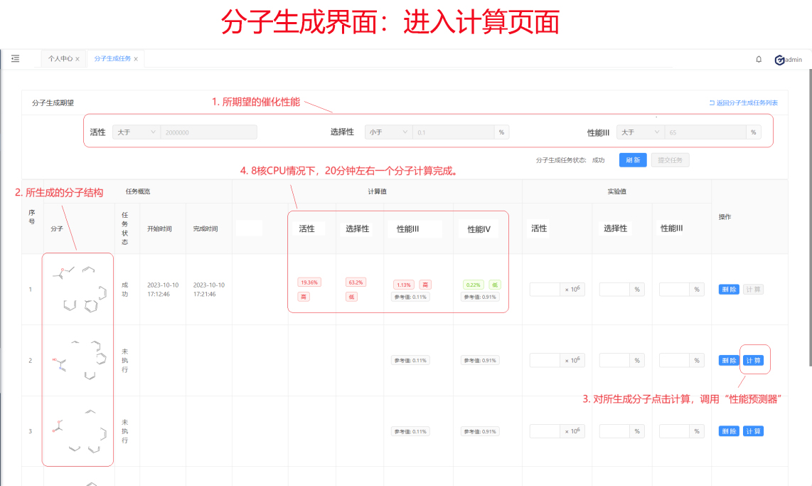 在有了清晰的“構(gòu)效關(guān)系”后,將其嵌入到分子生成算法中,算法便可以根據(jù)提示朝著所希望的性能去生成分子。結(jié)合前面的性能預(yù)測器一起使用,便形成一整套AI輔助下的催化劑設(shè)計(jì)工具。