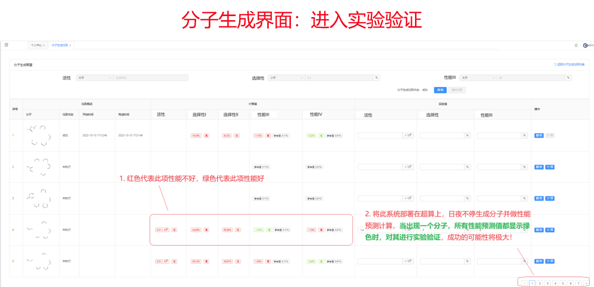 分子生成:直到生成預(yù)測值全部滿足要求的分子,然后選擇其進(jìn)入實(shí)驗(yàn)驗(yàn)證。