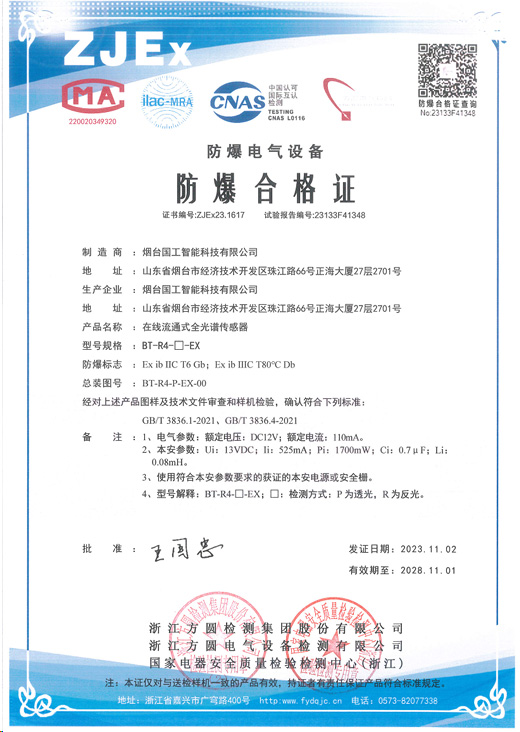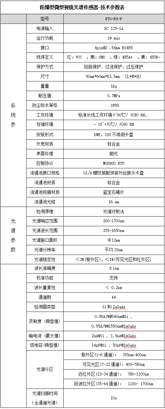 根據(jù)客戶現(xiàn)場情況,我們采用的是防爆型視鏡光譜傳感器。防爆型微型視鏡光譜傳感器對于傳統(tǒng)的視鏡、光譜傳感器分離的產(chǎn)品,該傳感器具有安裝更加方便,受環(huán)境干擾更小,使用安全性更高特點,并且不受游離堿和溫度等因素的影響,在檢測有效氯濃度的同時也能檢測游離堿濃度,更有利于實時準確判斷反應進度和反應終結點。