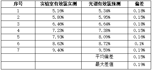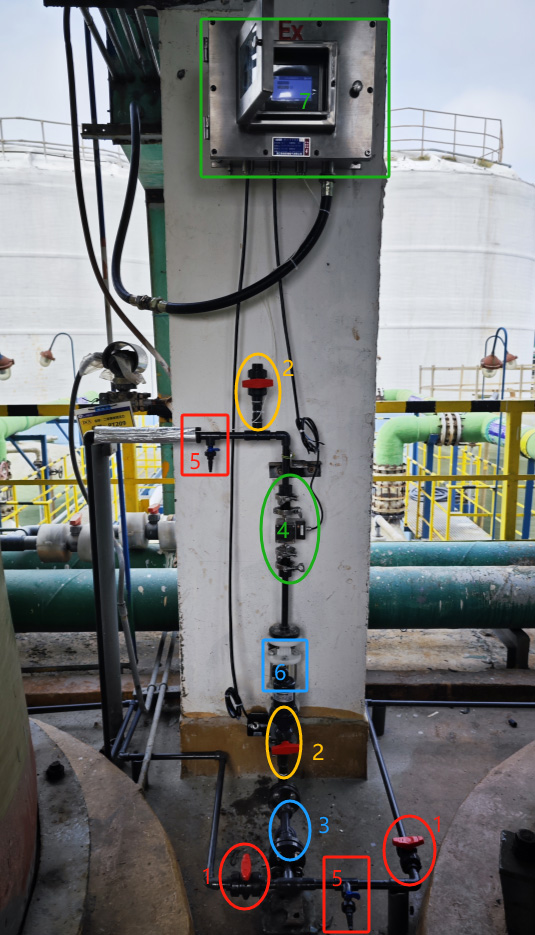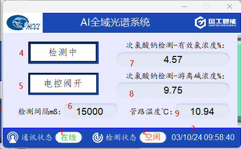 圖中圈1的地方為手動閥,當打開其中一個手動閥,物料即流經(jīng)管道,接著打開電磁閥(圈2)物料先經(jīng)過Y型過濾器(圈3),再經(jīng)過視盅(圈6),然后充滿光譜儀(圈4)一直流經(jīng)至取樣口(圈5),打開取樣口進行取樣送檢,同時光譜儀開始檢測,當實驗室檢測結果出來后,我們將同批次光譜檢測的物料有效氯的含量參數(shù)和游離堿的含量參數(shù)進行標定,以此類推,進行大量取樣檢測標定過程。檢測結果在光譜控制柜(圈7)上直接顯示。