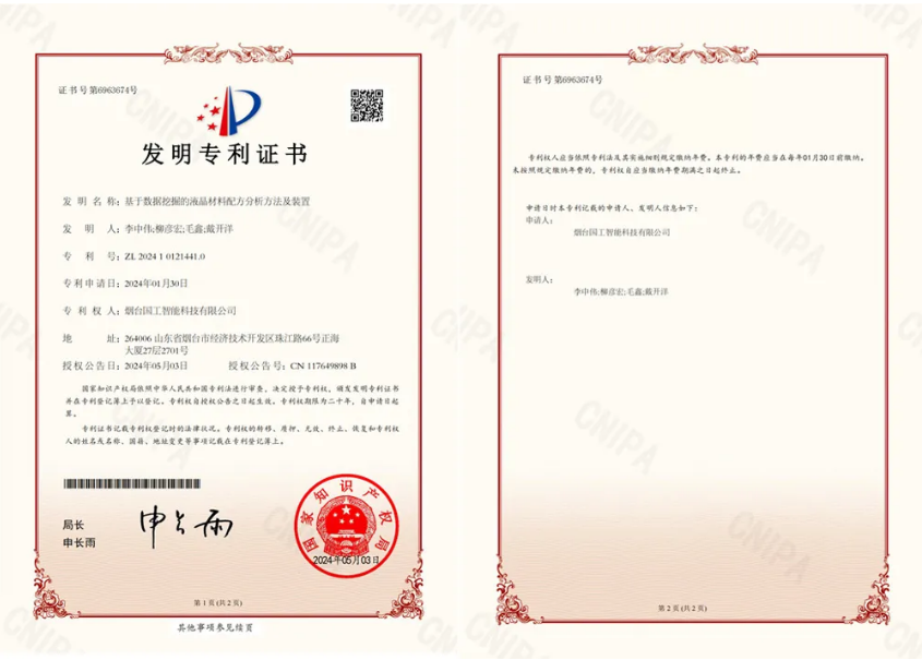 近日,國工智能新添國家知識產權局頒發的一項發明專利證書“基于數據挖掘的液晶材料配方分析方法及裝置”。