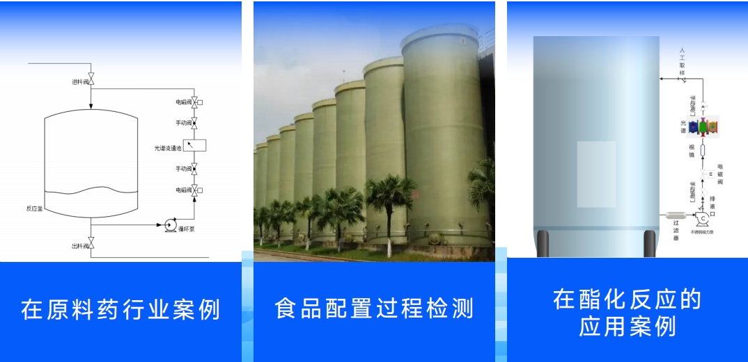 在線光譜儀對安裝于旁路管道進行在線檢測或者抽樣檢測,檢測固體雜質較少的液體,主要應用反應釜的反應過程檢測、罐區檢測和公用工程液體介質檢測。